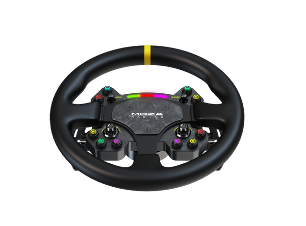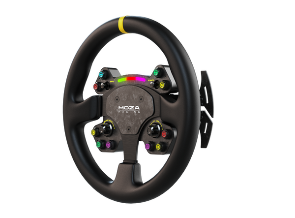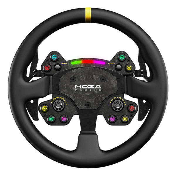 Upgrade your sim racing setup with the RS V2 Steering Wheel. This GT wheel offers compatibility with all MOZA wheelbases, seamlessly integrating for an optimized racing experience. Constructed using a combination of forged carbon fiber and aluminum, it ensures both resilience and elegance. Enjoy the 13-inch standard racing rim with an ergonomic design for utmost comfort during exhilarating races. Adorned with a genuine leather grip, it provides a stylish touch. Effortlessly install and remove it with the built-in quick-release mechanism. The LED RGB Rev Light heightens your racing immersion, while the carbon fiber magnetic shifters guarantee precise gear changes.